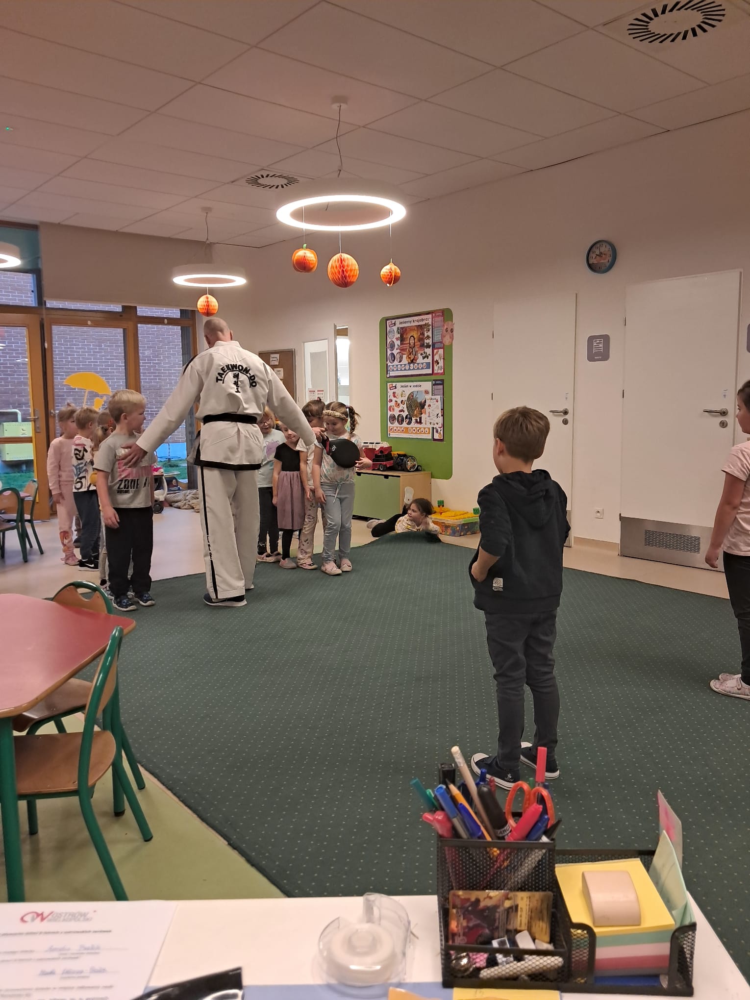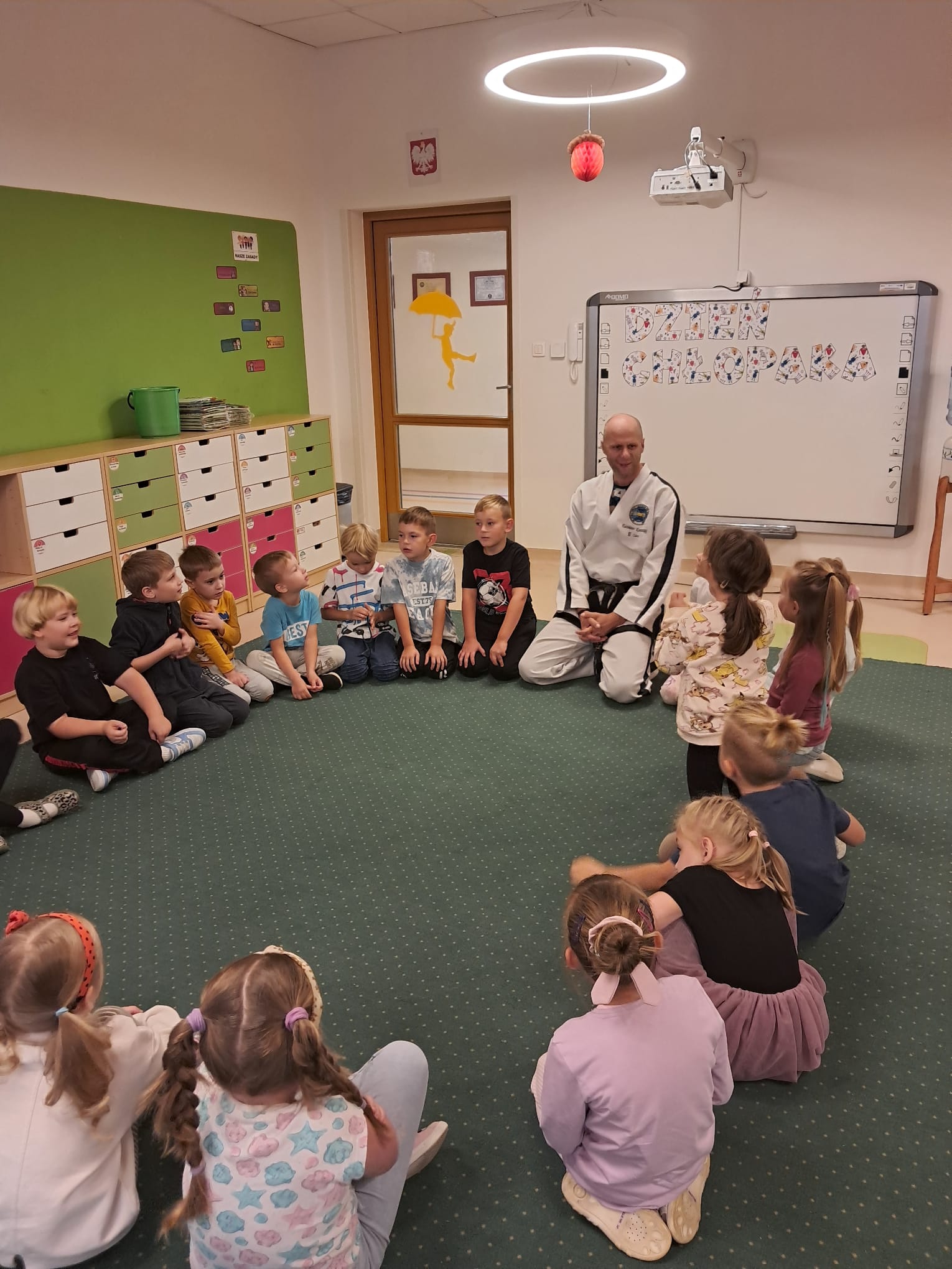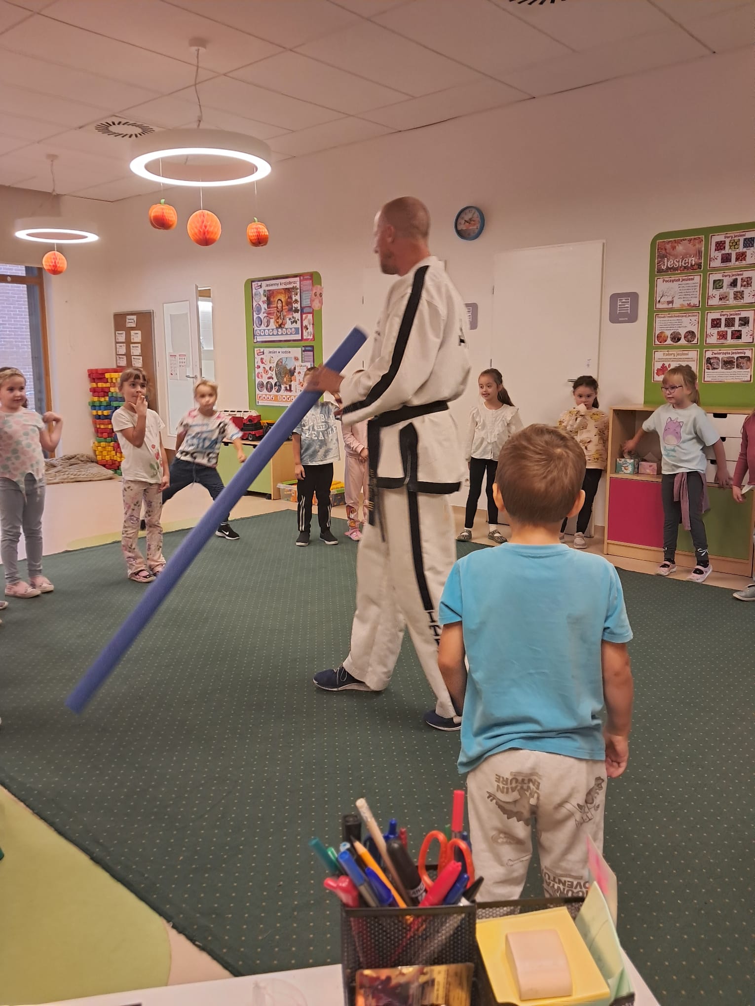 Z okazji Dnia Chłopca, który obchodziliśmy 30 września 2025 r., nasze przedszkolaki odwiedził wyjątkowy gość — trener taekwondo ze Sportowy Klub Taekwon-do Silla.