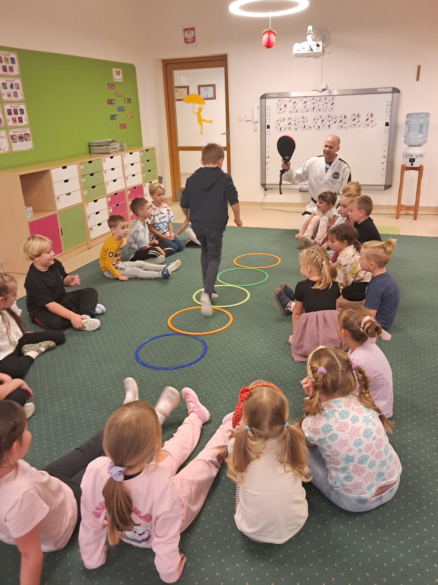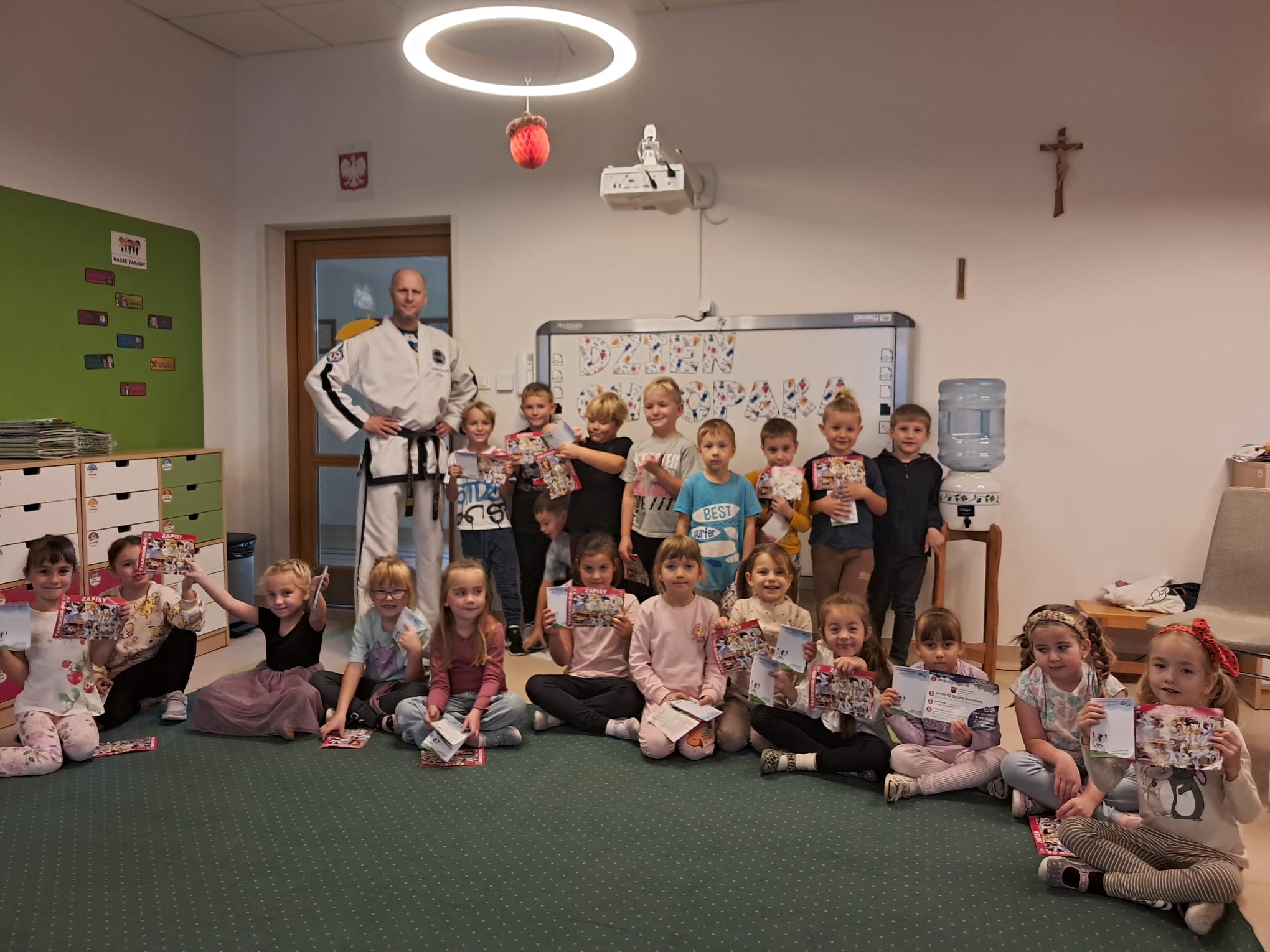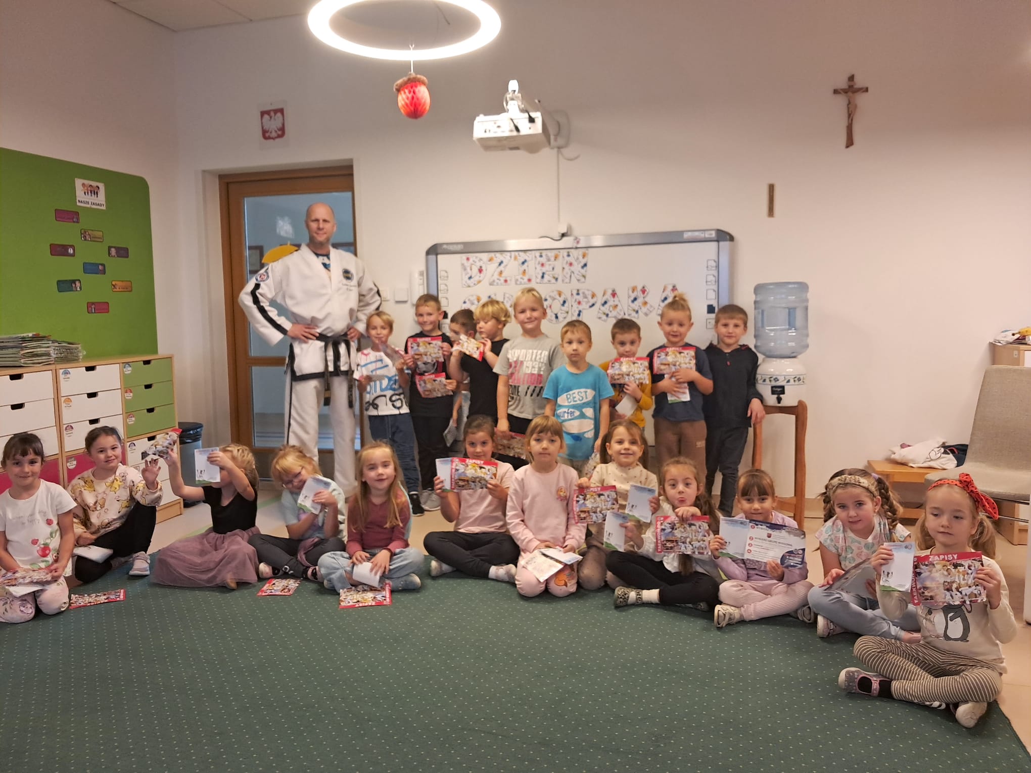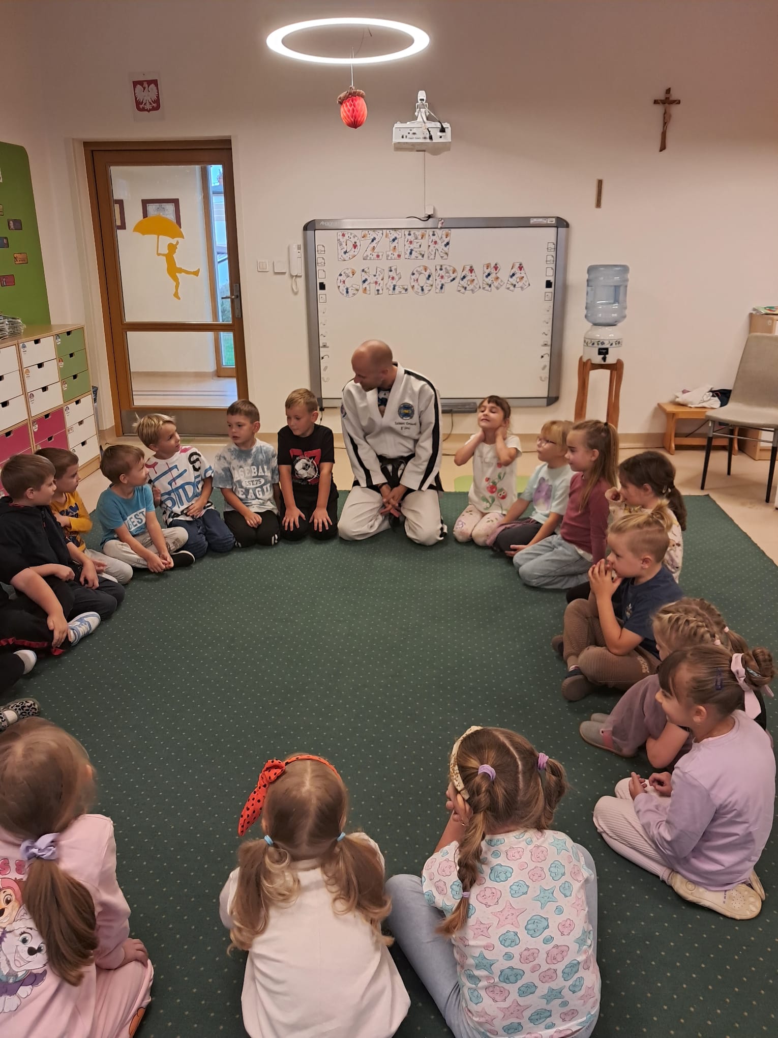 Z okazji Dnia Chłopca, który obchodziliśmy 30 września 2025 r., nasze przedszkolaki odwiedził wyjątkowy gość — trener taekwondo ze Sportowy Klub Taekwon-do Silla.