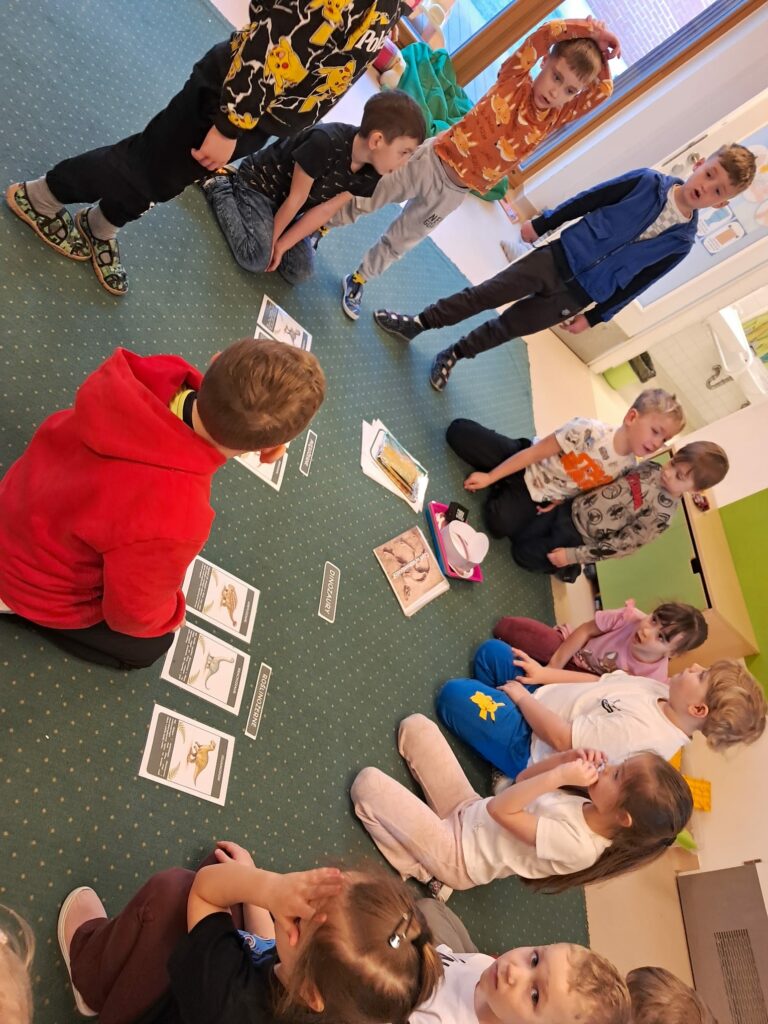 Dzieci z ogromnym zaangażowaniem uczestniczyły w „dinozaurowych” tańcach i zabawach ruchowych. Było dużo śmiechu, kiedy udawaliśmy dinozaurze jajka, z których następnie „wykluwały się” małe dinozaury.