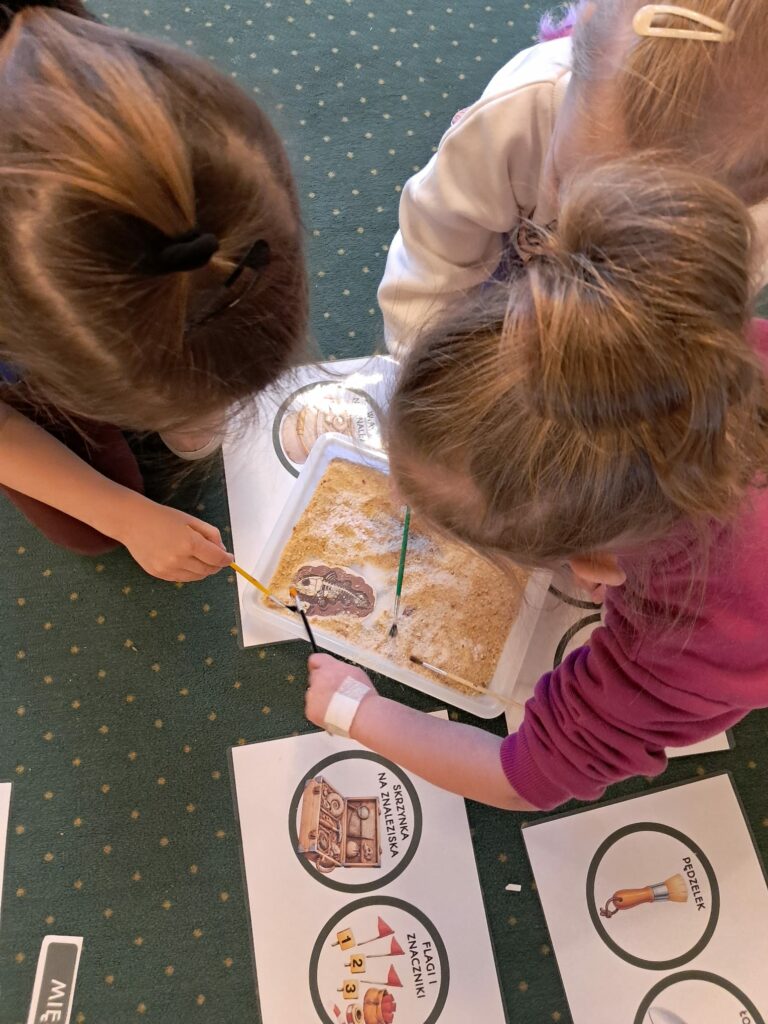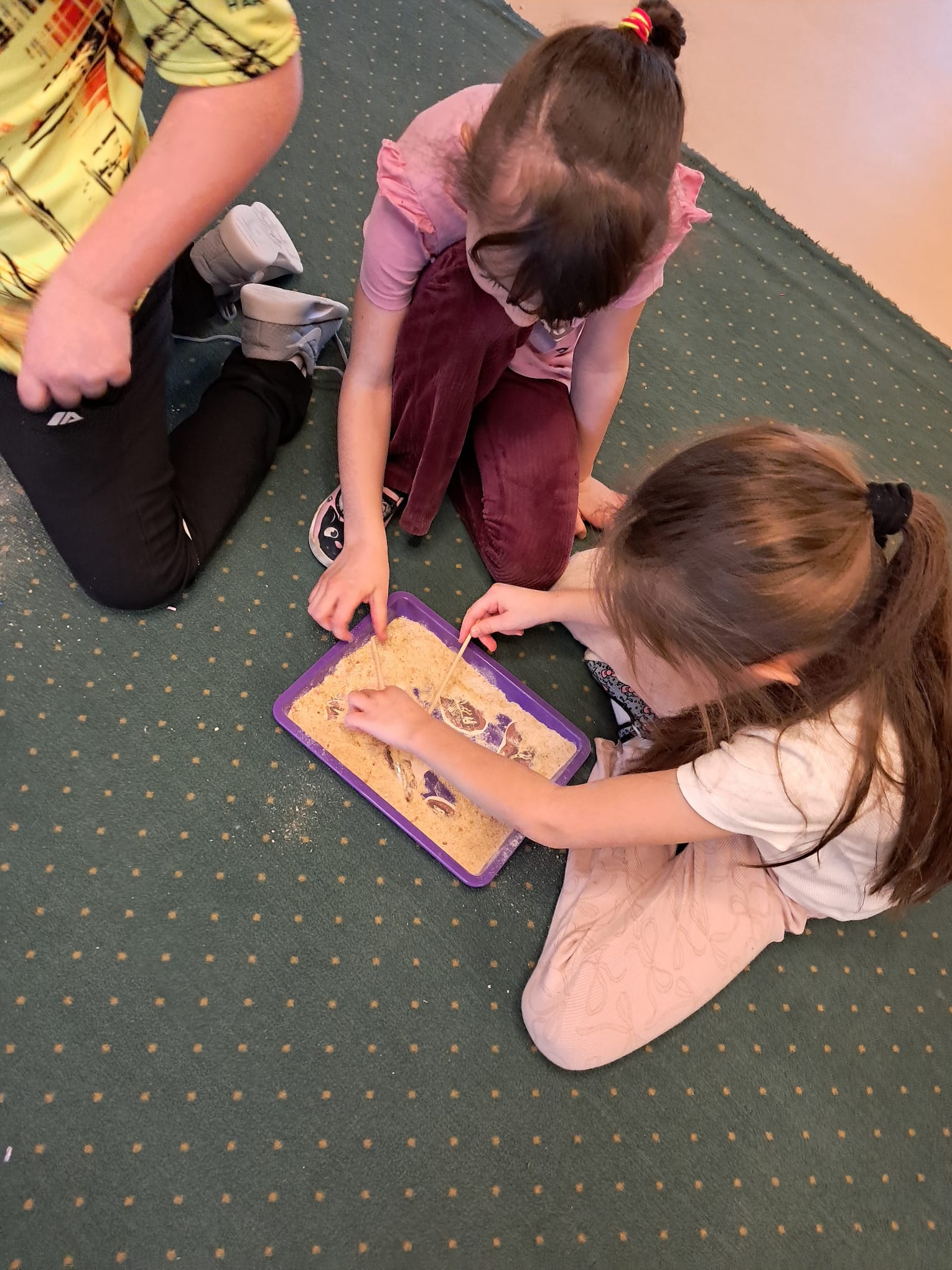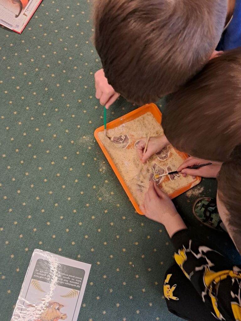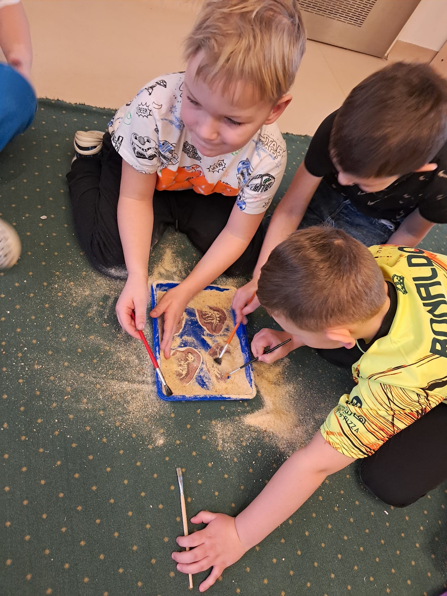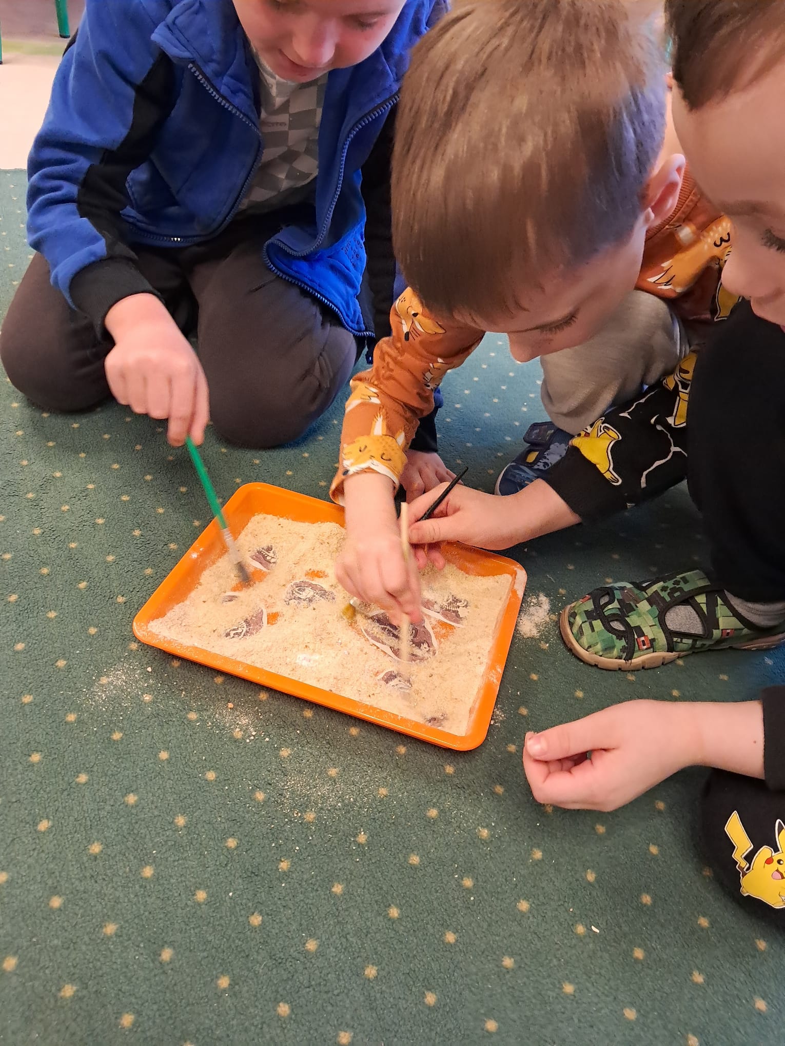 Poznaliśmy również niezwykle ciekawy zawód paleontologa. Przedszkolaki dowiedziały się, na czym polega praca badaczy dawnych dziejów i same wcieliły się w ich rolę podczas zabawy w wykopaliska.