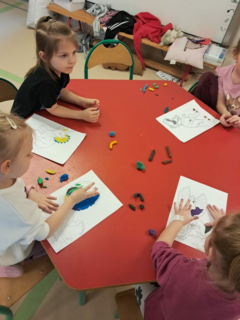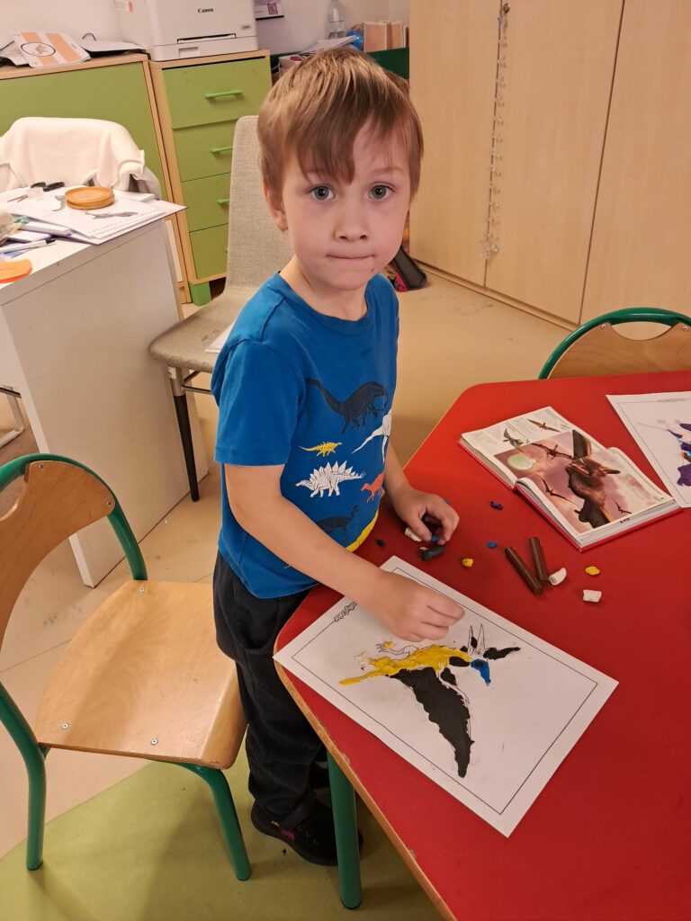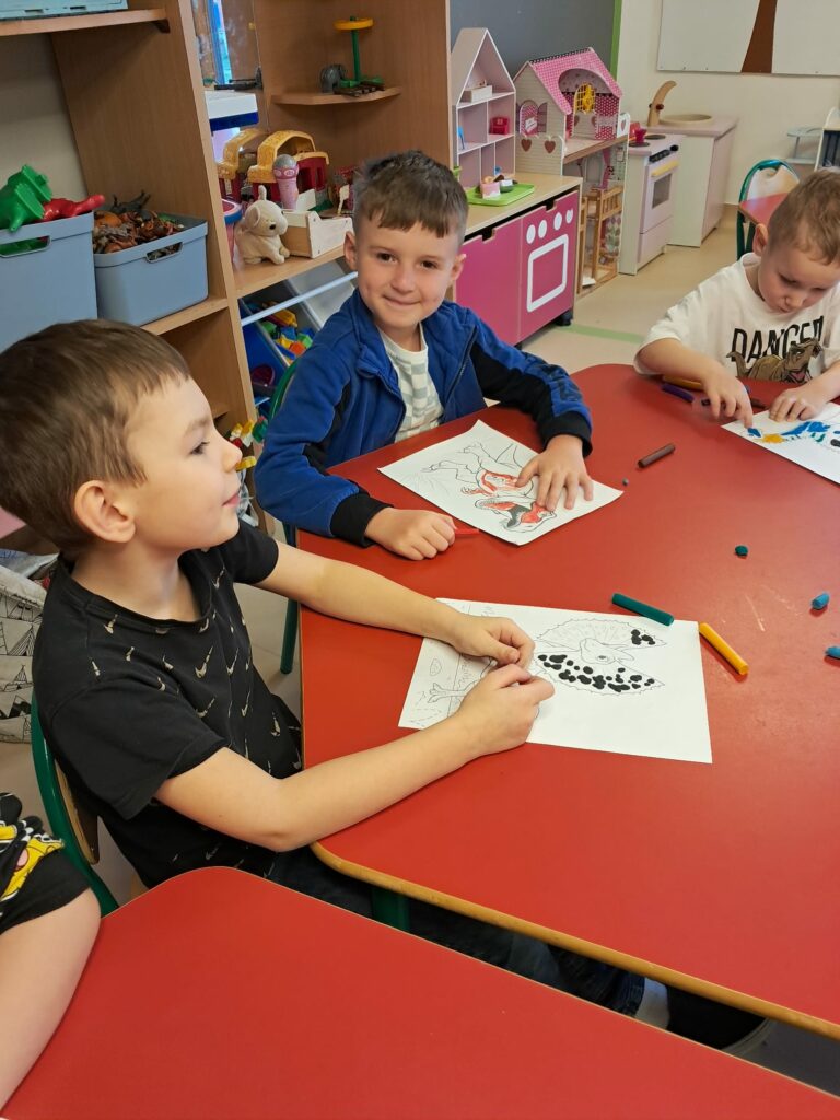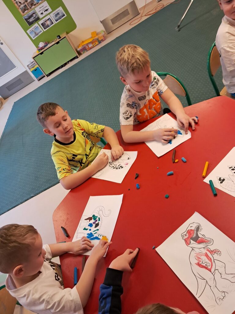 Podczas zajęć rozmawialiśmy także o tym, dlaczego dinozaury wyginęły. Dzieci poznały różne teorie i chętnie dzieliły się swoją wiedzą. Uczyliśmy się również rozróżniać dinozaury roślinożerne i mięsożerne, segregując je według sposobu odżywiania.
