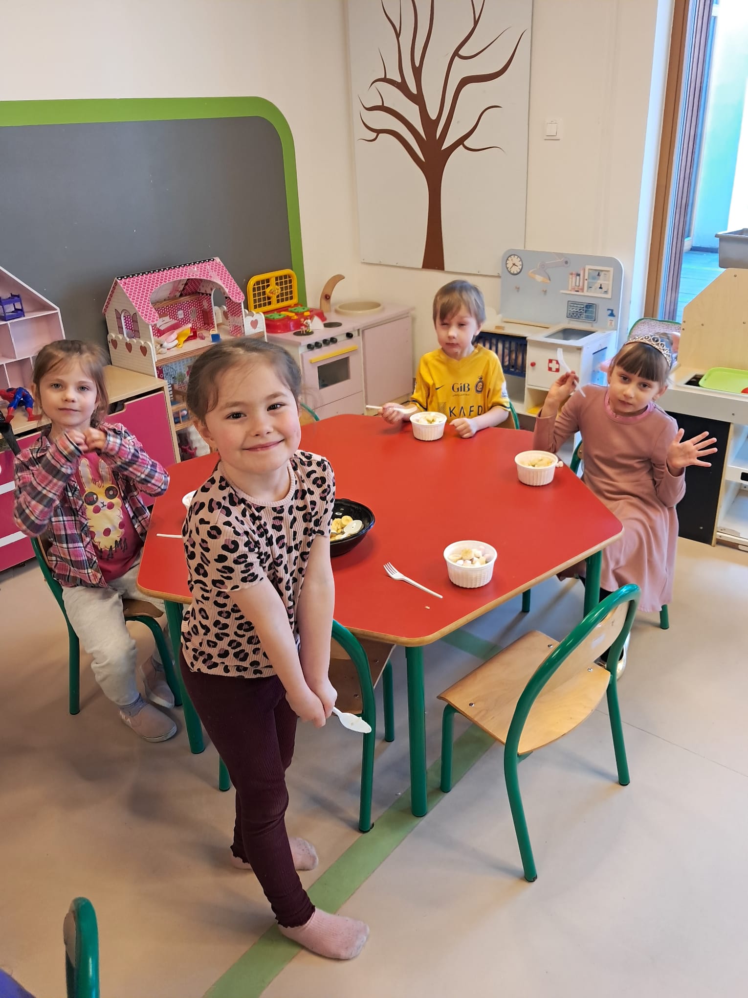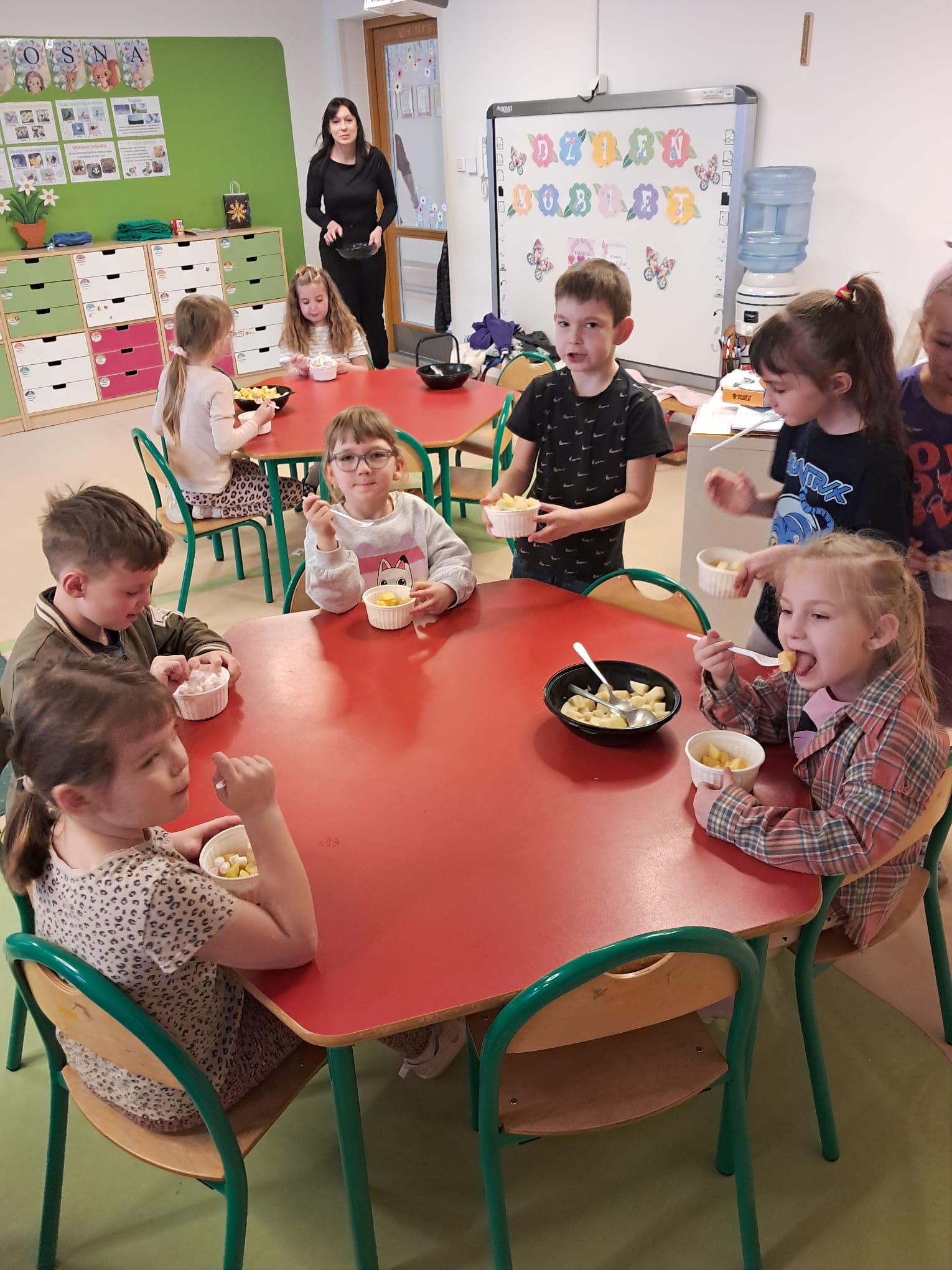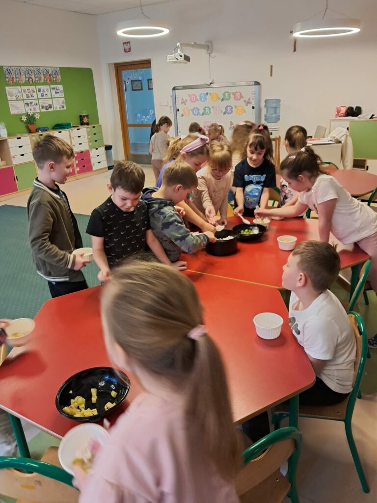 Z tej okazji dzieci przygotowały własną, pyszną sałatkę owocową, którą później wspólnie degustowały. Była to świetna okazja do nauki samodzielności oraz dobrej zabawy.