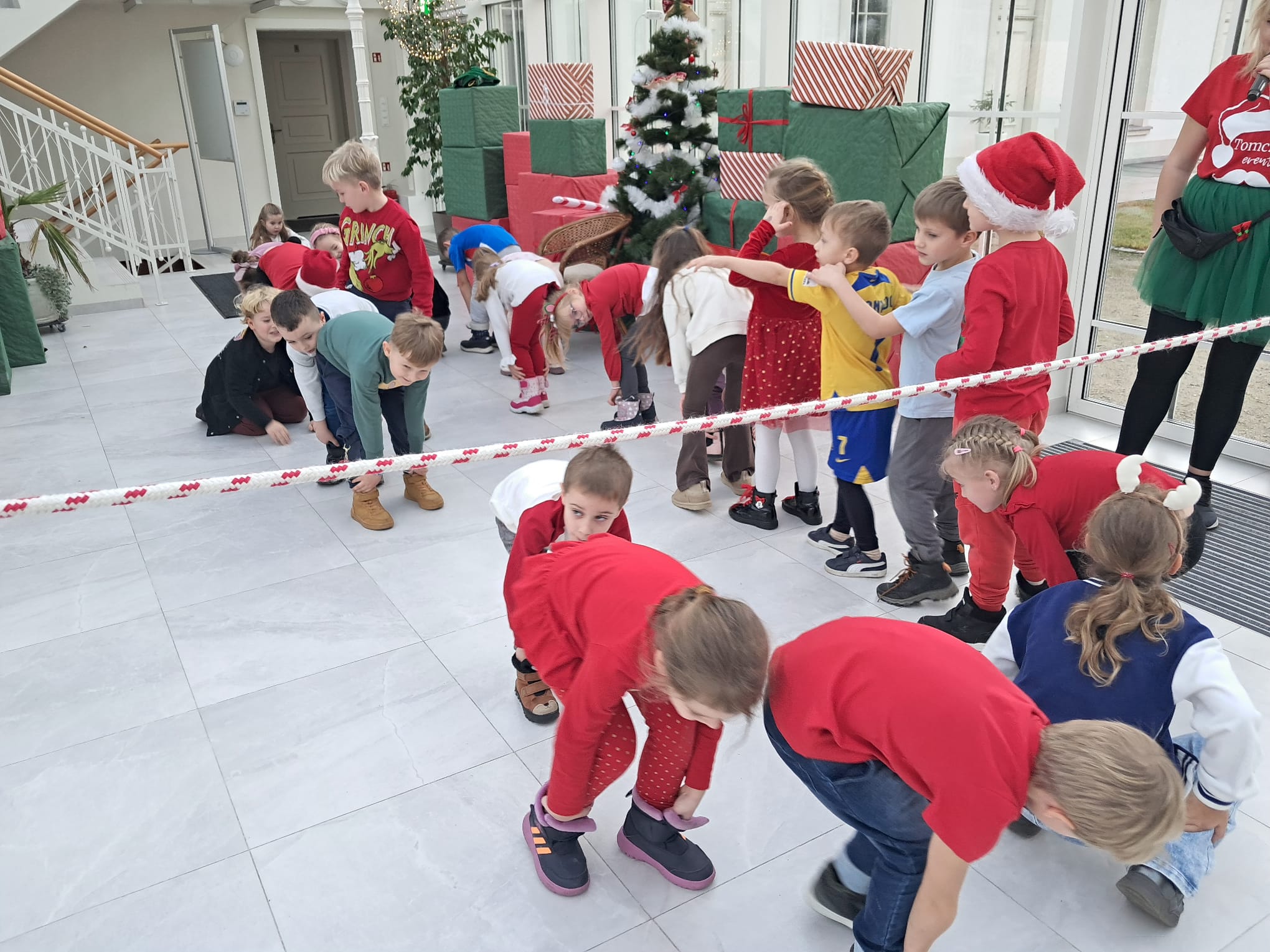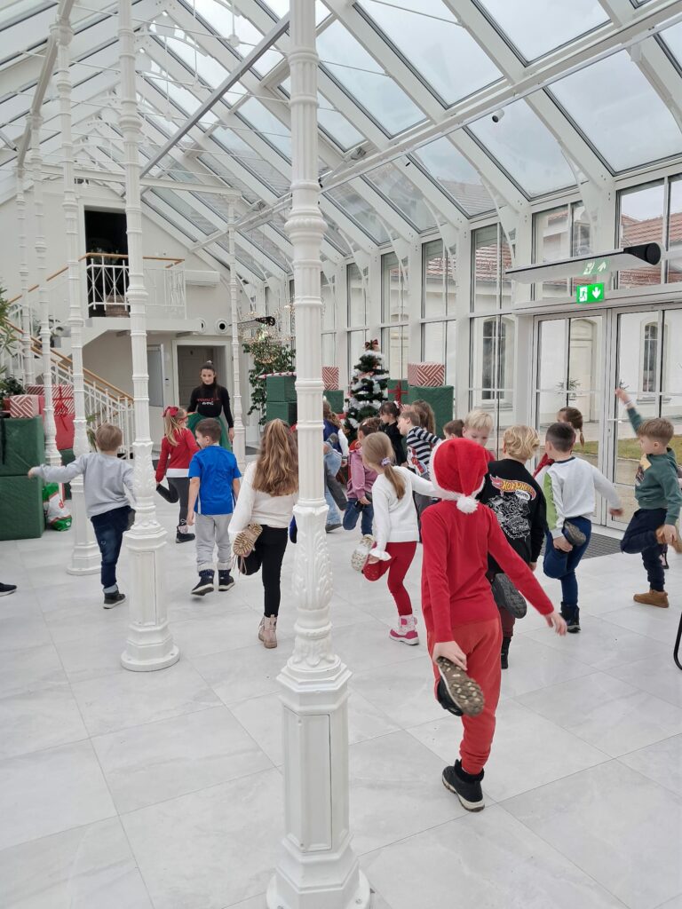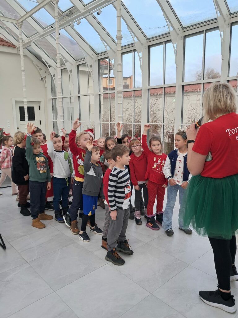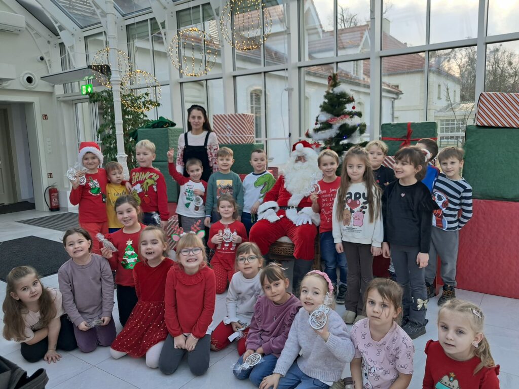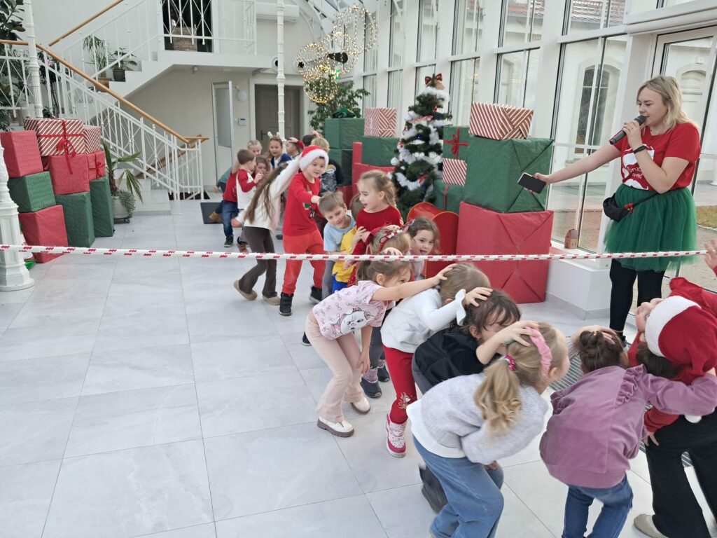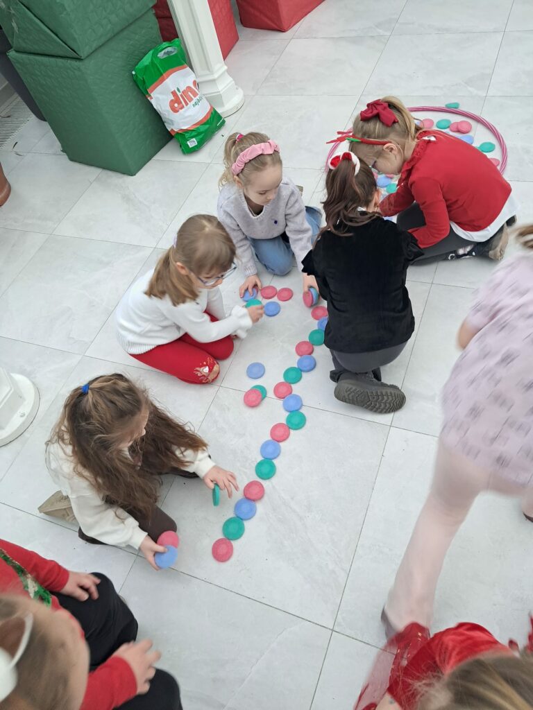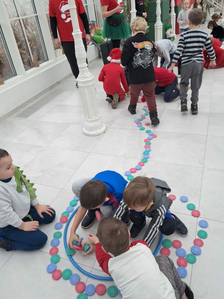 Podczas świątecznych warsztatów dzieci przeniosły się w magiczny, zimowy świat. Zamieniały się w choinki, które należało przystroić kolorowymi klamerkami, budowały wyjątkowy tor dla Mikołaja, brały udział w przeciąganiu liny oraz w autorskich zabawach ruchowych.