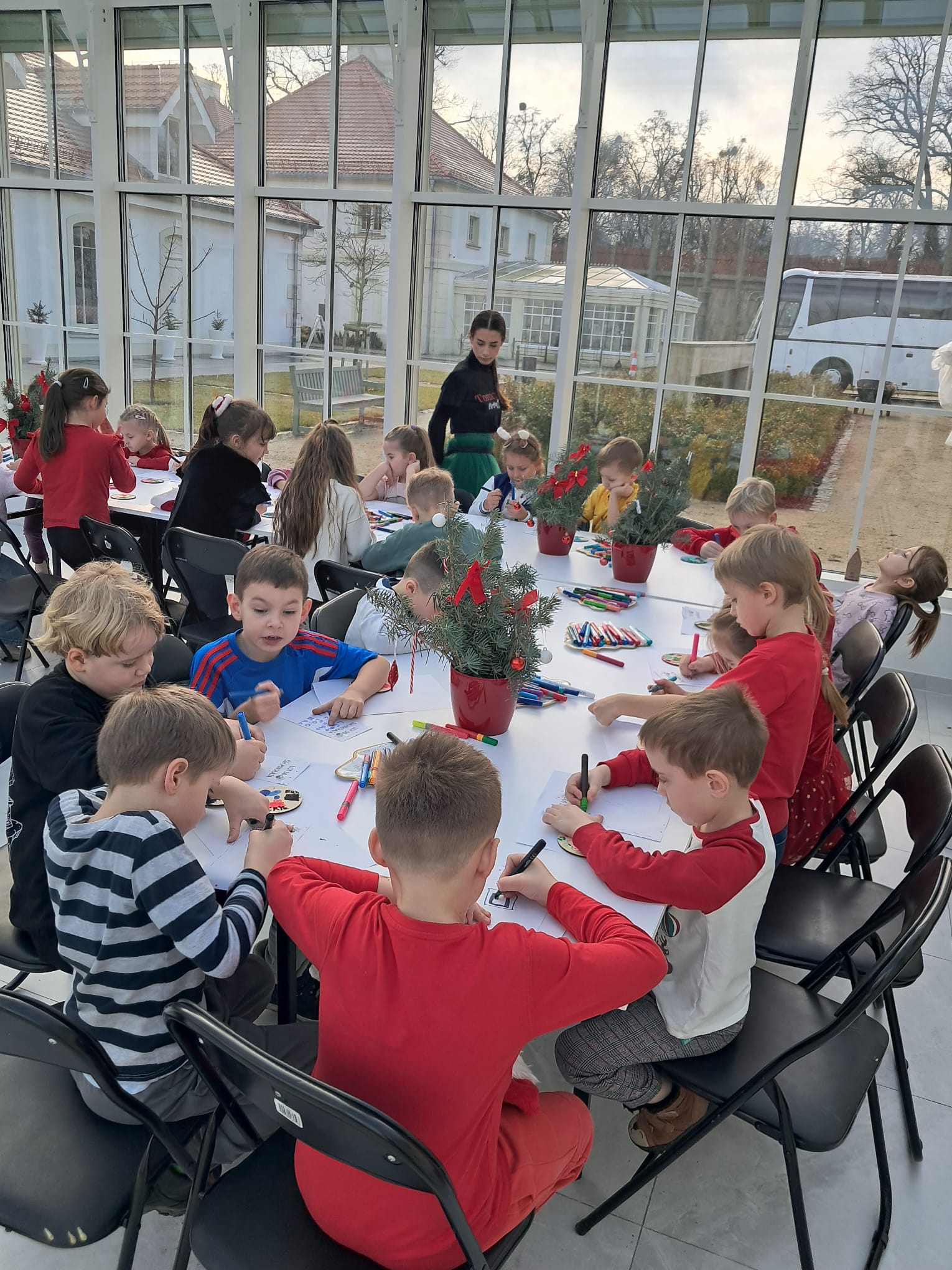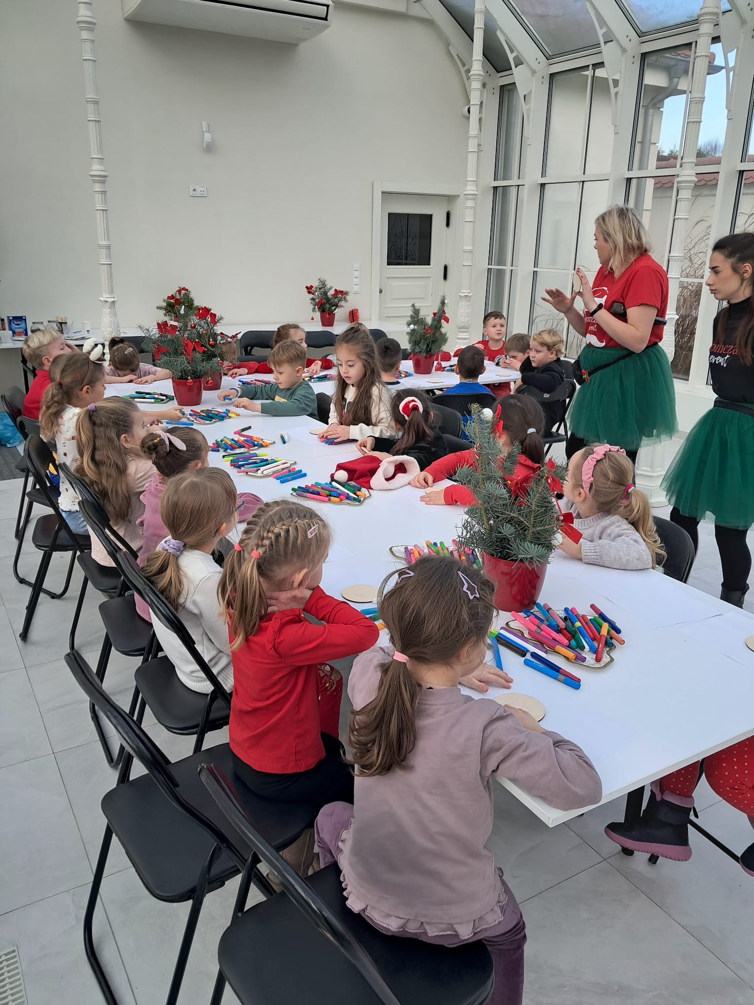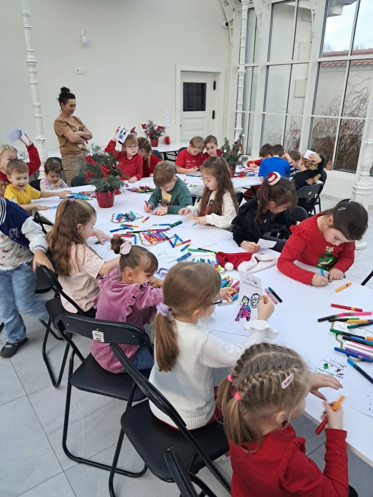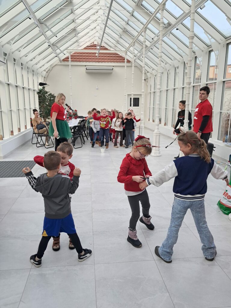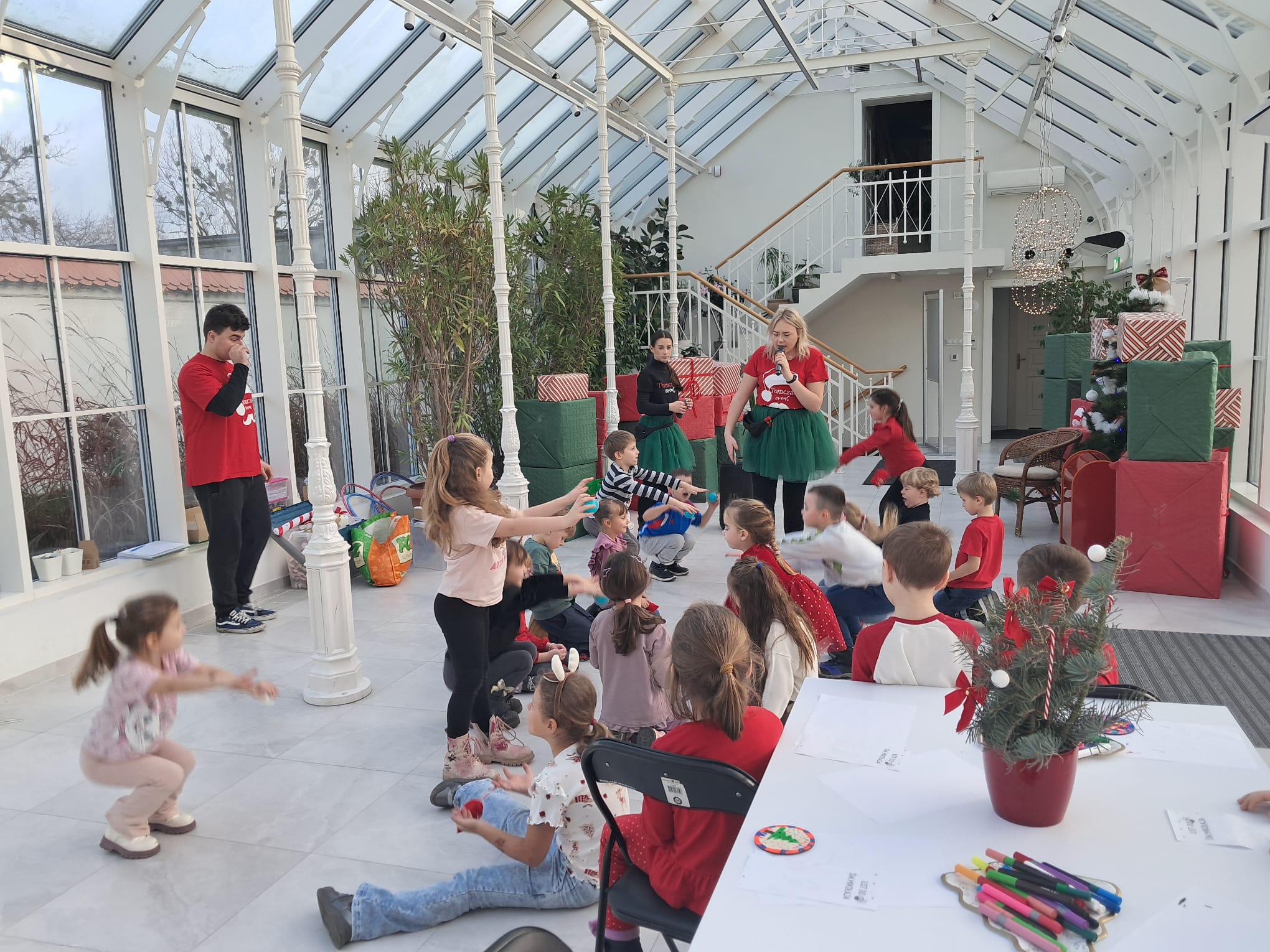 Podczas świątecznych warsztatów dzieci przeniosły się w magiczny, zimowy świat. Zamieniały się w choinki, które należało przystroić kolorowymi klamerkami, budowały wyjątkowy tor dla Mikołaja, brały udział w przeciąganiu liny oraz w autorskich zabawach ruchowych.